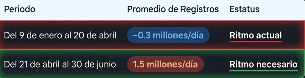 El cálculo para el fracaso es simple. Desde que inició el registro el pasado 9 de enero del 2026,el promedio diario ha sido de apenas 296 mil registros.